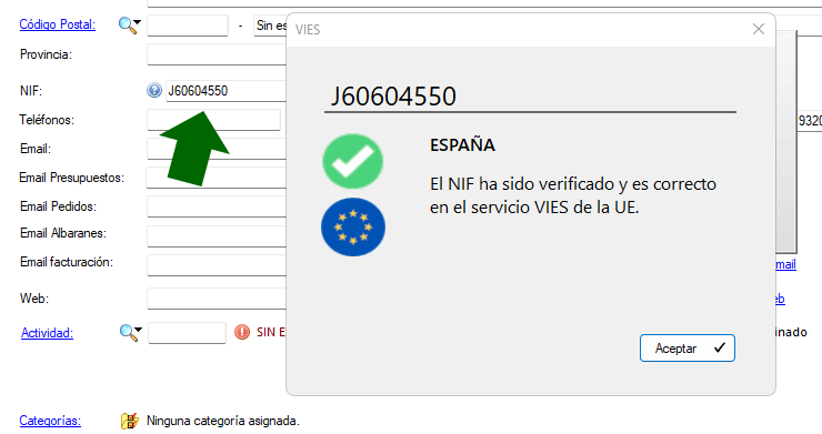 Desde el NIF podrá con un solo clic comprobarlo. Zynara se conectará al servicio VIES de la UE y le informará si el NIF está registrado en la base de datos del Estado miembro.