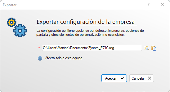 Exportar la configuración de la empresa actual a un archivo en una carpeta que elija el usuario. De forma predeterminada se asume la carpeta de Mis Documentos del usuario y el nombre único de la empresa (generalmente Zynara_XXXX). La extensión del archivo es .reg, dado que es un archivo de registro Windows y no debe ser cambiada.