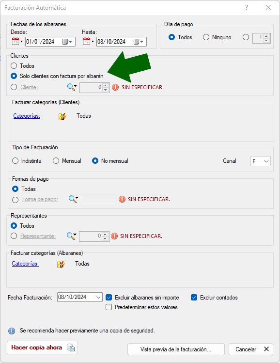 En la facturación automática se ha añadido la opción de facturar únicamente los clientes definidos como factura por albarán. Esta opción factura únicamente los clientes en cuya ficha maestra se haya marcado, en la pestaña Financiera, la opción «Factura por Albarán».