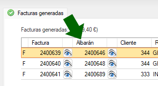 Se facturarán los albaranes por orden de su número, y en el resultado final de mostrará, además de la factura, el albarán que lo contiene.